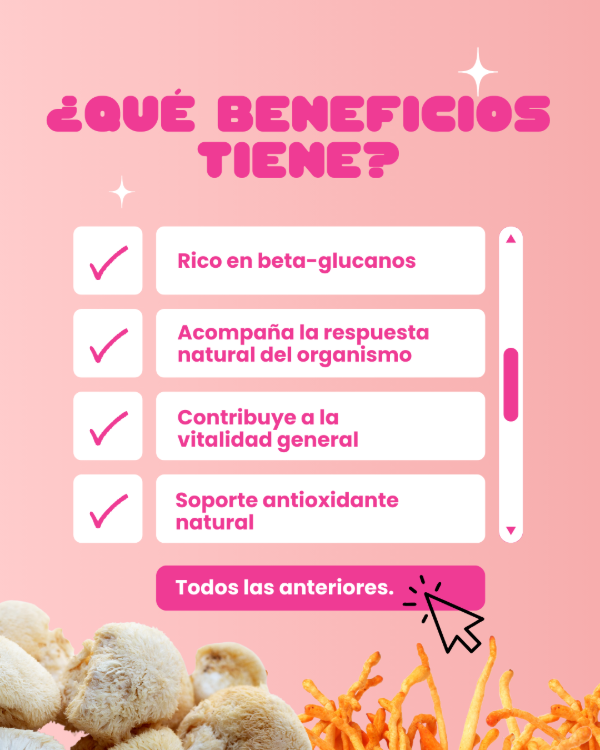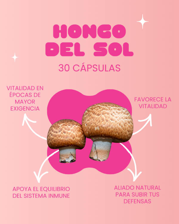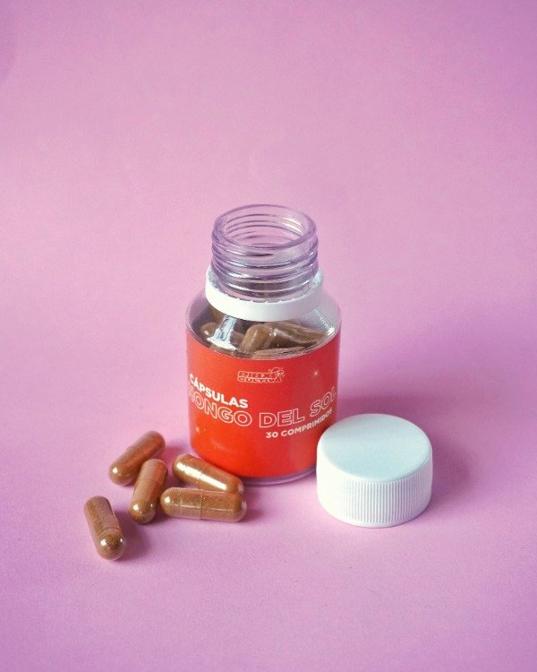 Cápsulas de Hongo del Sol, reconocido por su alto contenido en beta-glucanos y su apoyo al sistema inmune.