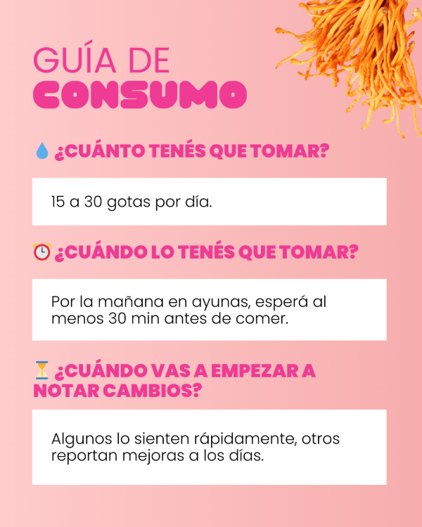 El cordyceps es un hongo adaptógeno asociado al aumento de la energía, la vitalidad y la resistencia. En tintura doble extracto, es ideal para quienes sienten cansancio, fatiga o baja motivación, sin generar picos ni nerviosismo.